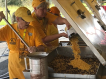 The team is composed of 165 volunteer members from all over southwest Arkansas. All have had six hours of training, and many have had advanced training. The team has three trucks, three trailers and a bus. They carry the necessary equipment to prepare up to 12,000 meals per day. They work in accordance with agreements with the American Red Cross and The Salvation Army. Basically the agreements provide that Southern Baptist teams provide the mobile kitchens and the necessary personnel to staff them, they (Red Cross and Salvation Army) provide the bulk food and the necessary services (fuel, water, ice, garbage service, forklifts, steps, food storage trailers, etc.), Southern Baptist prepare the meals, and jointly they are delivered by mobile routes and/or served at the preparation location, usually a Baptist church where the team is staying.