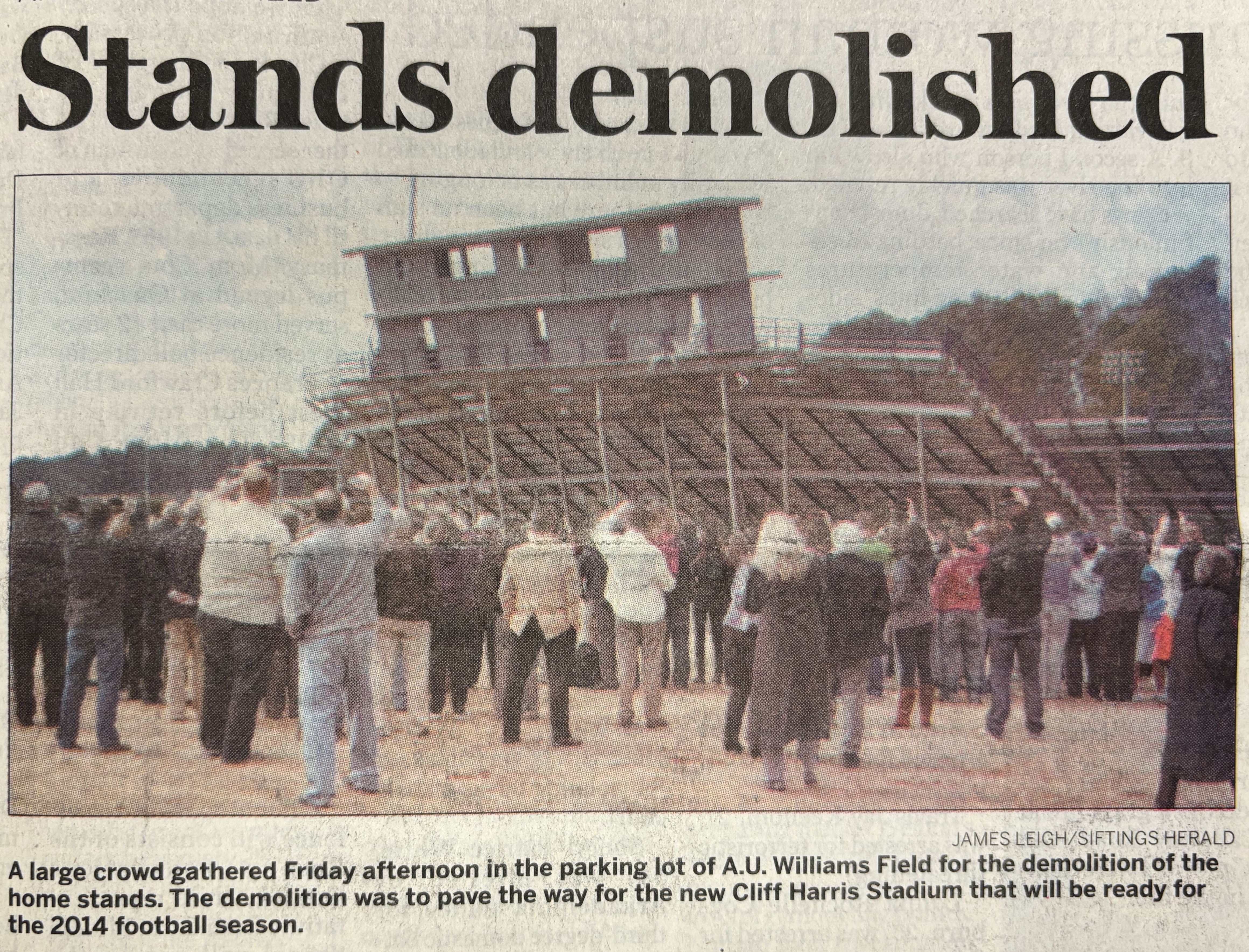 • A large crowd gathered on a Friday afternoon in 2014 in the parking lot of Ouachita Baptist University’s A.U. Williams Field for the demolition of the home stands. The demolition was to pave the way for the new Cliff Harris Stadium that would be ready for the 2014 football season.