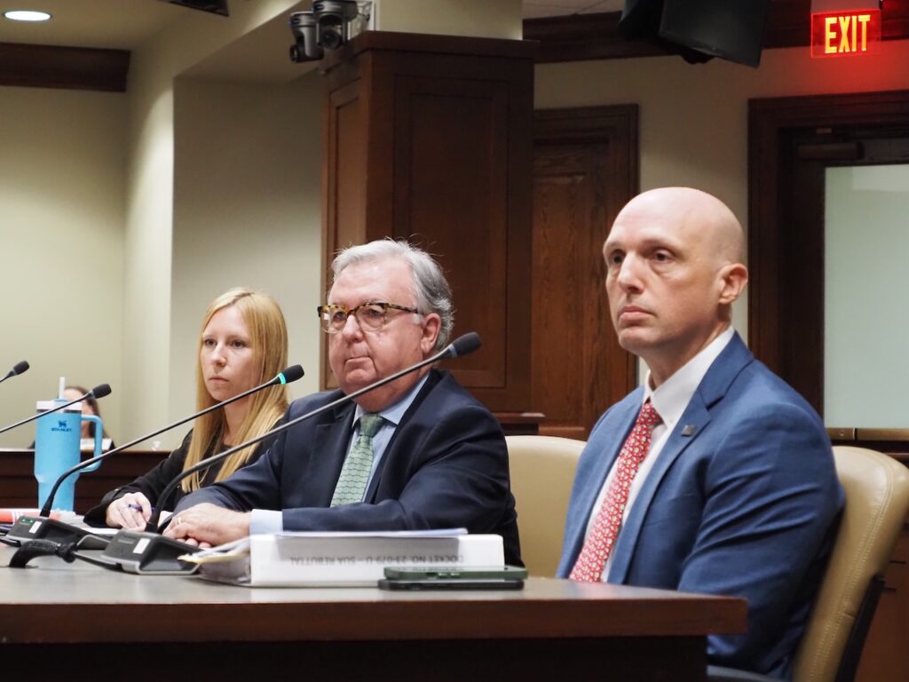 PHOTO: Danni Hoefer, Doyle Webb and Michael Marchand (left to right) with the Arkansas Public Service Commission answer questions about a proposed natural gas rate increase from lawmakers during a committee meeting on Oct. 28, 2024. | Mary Hennigan/Arkansas Advocate