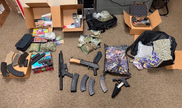 During execution of the search warrant, officers found more than 4 pounds of marijuana, more than 150 THC vapes, baggies, digital scales and assorted drug paraphernalia. Additionally, officers seized multiple weapons including a mini-Draco 7.62 semi-automatic pistol; a Glock 43x semi-automatic pistol, an AT Alpha Maxx 5.56mm semi-automatic firearm, an FN model FNS-9 9mm handgun and a Glock 19x 9mm semi-automatic pistol along with more than 450 rounds of ammunition.