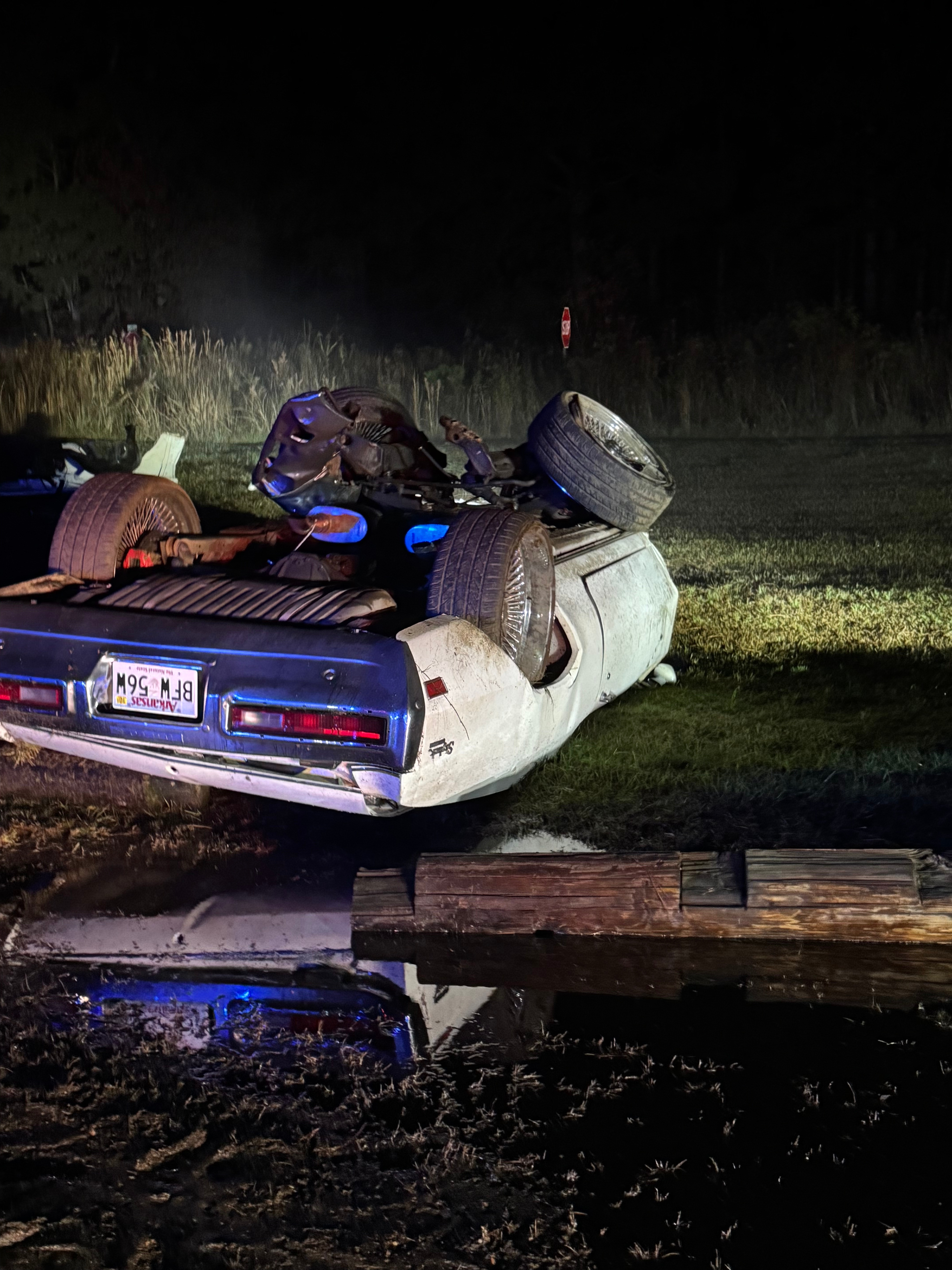 PHOTO: A convertible sits upside down south of Gurdon, Arkansas, on Nov. 21, 2025. Two Gurdon men were ejected in the rollover after the driver allegedly fled from a Gurdon police officer.