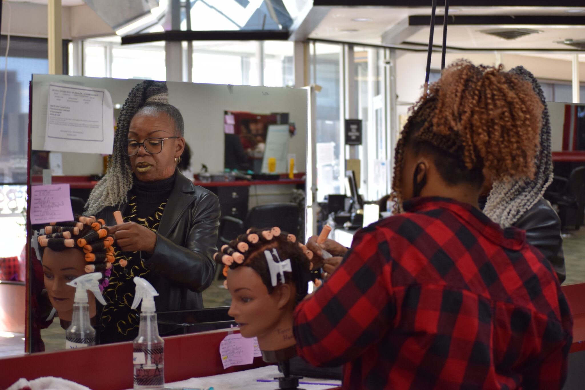 Ruby Welch assists a student at Arkansas Beauty School in Little Rock on Dec. 10, 2025. Welch is one of the many formerly incarcerated Arkansans who stays tied to the criminal justice system after their release due to fines and fees. | Photo by Antoinette Grajeda/Arkansas Advocate