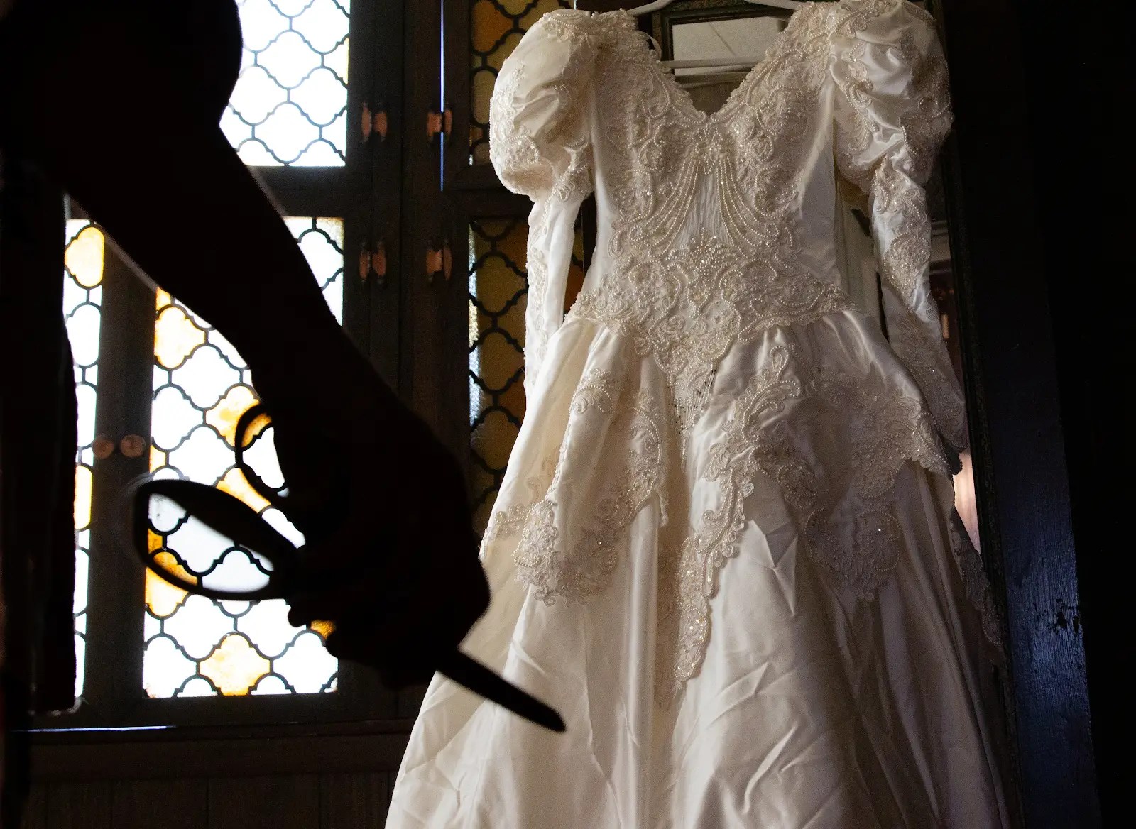 PHOTO: The seamstress who repurposed a wedding dress is pictured holding a pair of scissors silhouetted against the dress. | Abigail Fowler photo