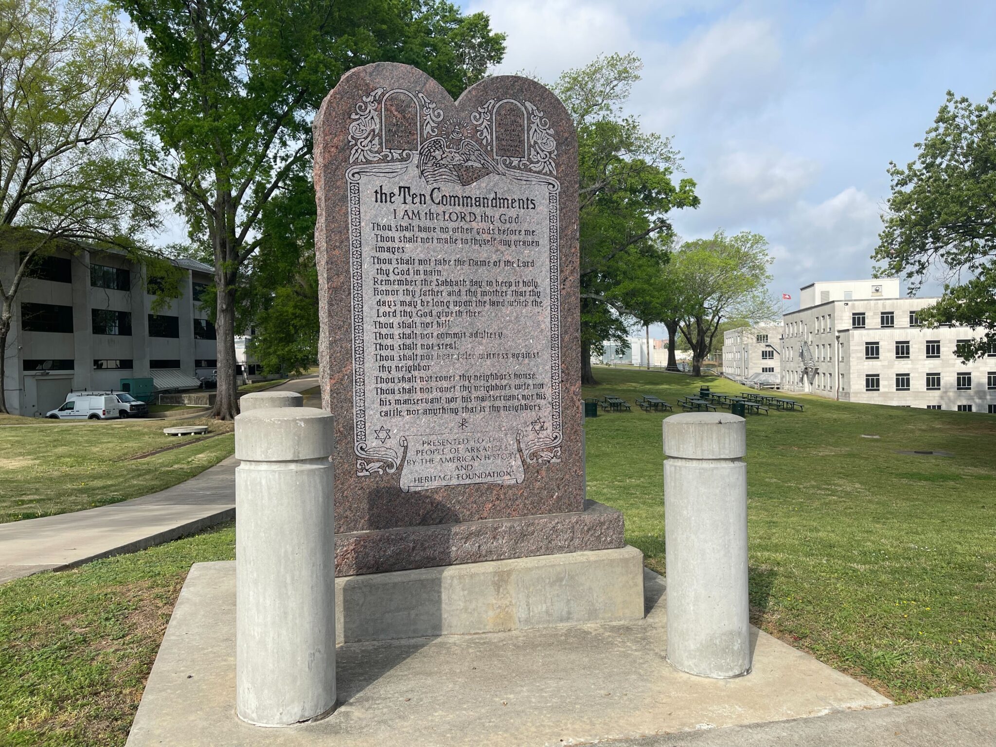 BLOCKED, FOR NOW — A Ten Commandments monument is on display outside the Arkansas State Capitol on April 1, 2026. | Andrew DeMillo/Arkansas Advocate