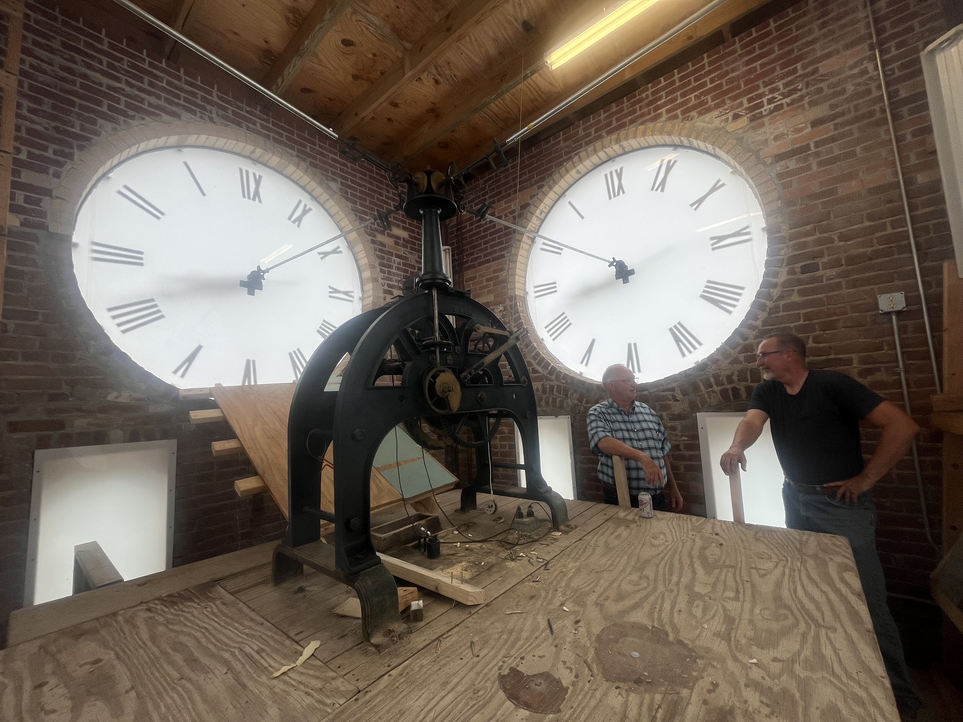 WINDING DOWN FOR THE DAY — Clark County Judge Troy Tucker, left, talks with horologist David Jackson in the courthouse clock tower. Jackson made repairs to the clock, which sustained major damages in a 2025 thunderstorm. | arkadelphian.com photo by Joel Phelps