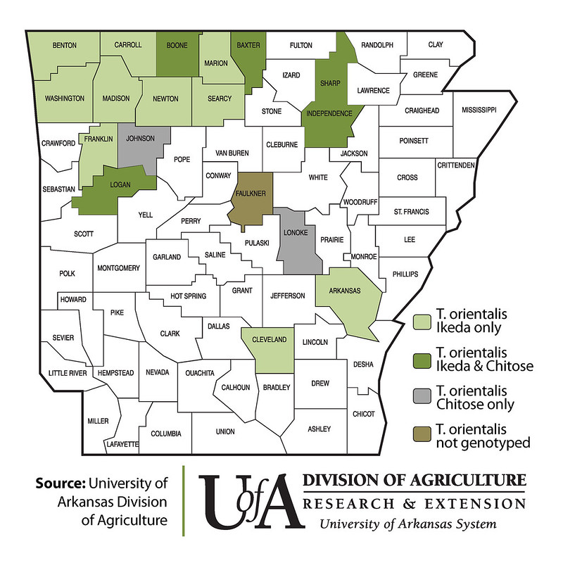 In May 2025, the tick was confirmed in Arkansas in Benton, Boone, Independence, Searcy and Washington counties. The Theileria orientalis Ikeda genotype was confirmed in Arkansas, Baxter, Boone, Carroll, Marion, Searcy and Washington counties. The Theileria orientalis Chitose genotype was also confirmed in Boone and Baxter counties.