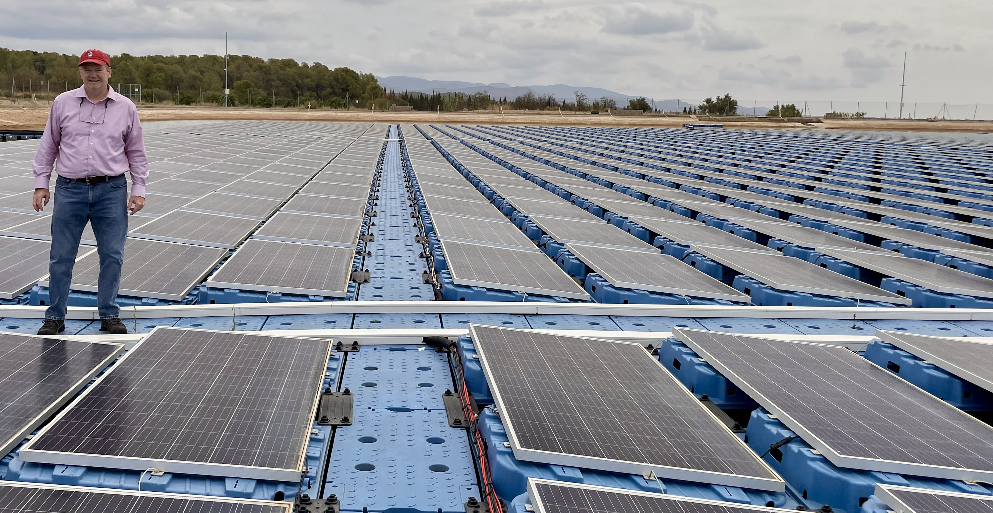 FLOATING SOLAR — Michael Popp, professor of agricultural economics and agribusiness, stands on a floating solar array in Spain in 2024. Popp’s research into floating solar panels at the Rice Research and Extension Center in Stuttgart includes a public perception survey. | Photo courtesy of Mike Popp
