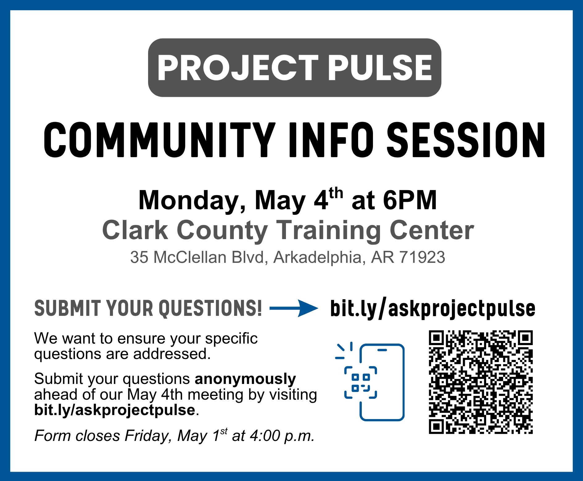 A Community Information Meeting regarding Project Pulse is planned for Monday, May 4, 2026, at 6 p.m. at the Clark County Training Center in the Industrial Park, 35 McClellan Blvd, Arkadelphia.
